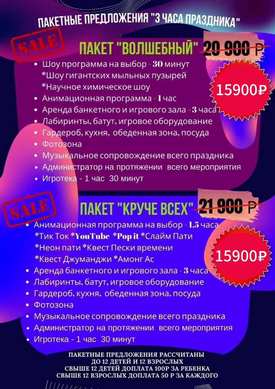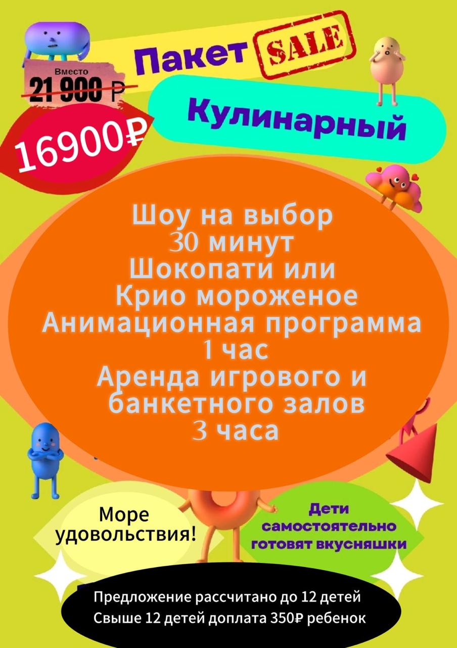 Анимационные программы, всевозможные шоу - программы, квесты, дискотеки с ленточным шоу, кулинарные мастер-классы и много другое!